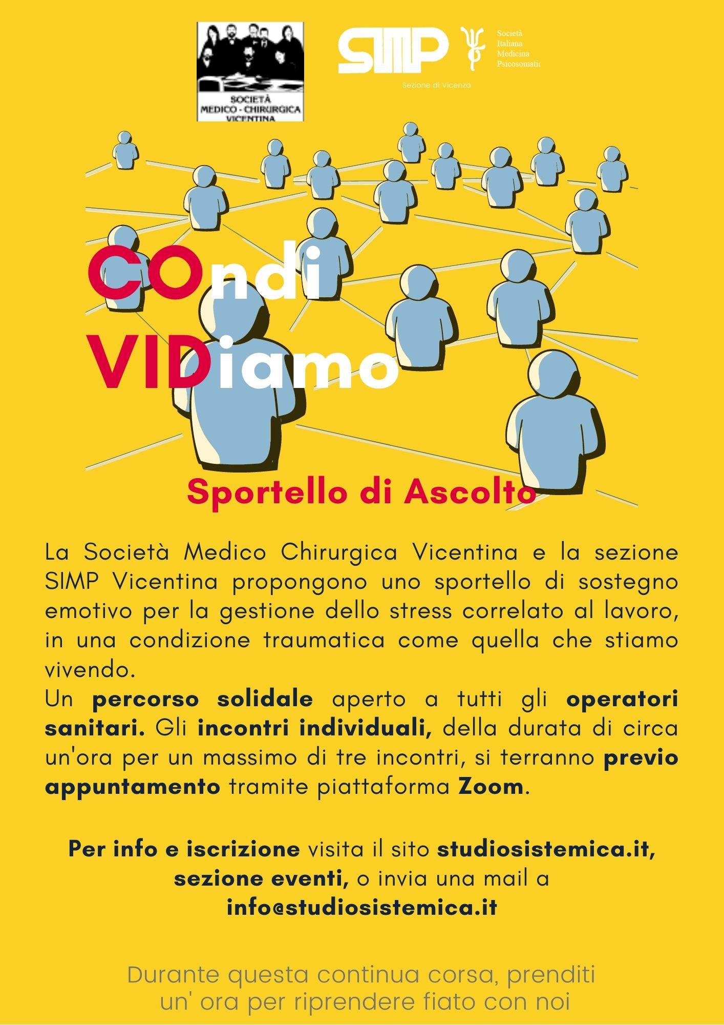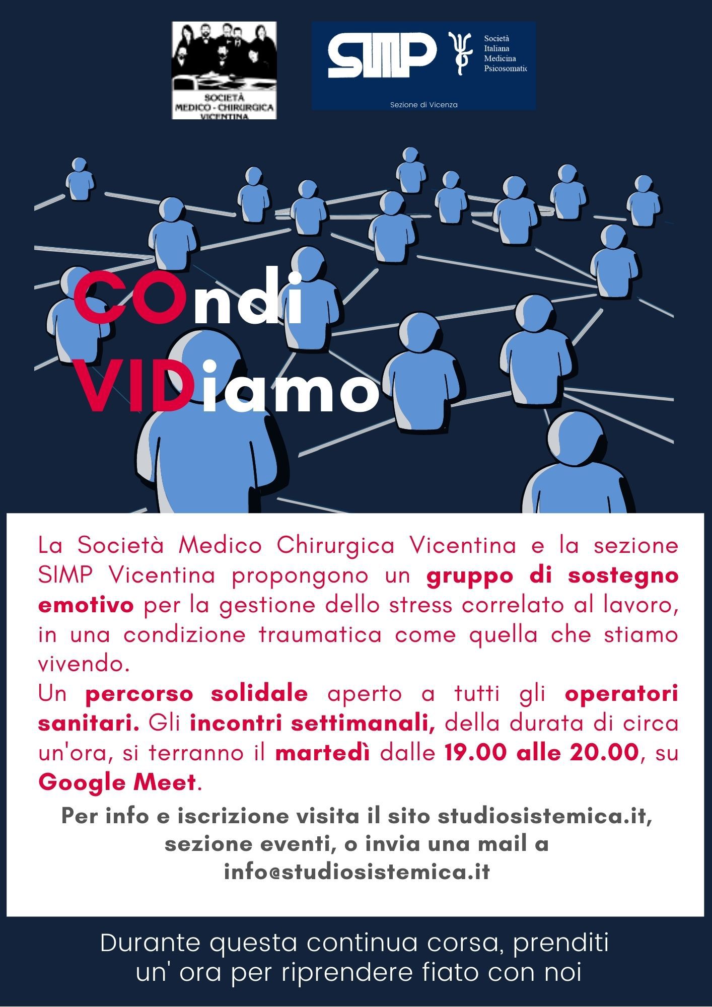 In questo periodo ci troviamo di fronte ad una condizione di trauma planetario e continuato. Per gestire tale stress, anche in ambito lavorativo, è necessario e fondamentale attuare misure di “decompressione” emotiva al fine di ridurre il rischio di insorgenza di forte disagio psicofisico. In particolare, in ambito sanitario, lo stress lavorativo a cui sono purtroppo sottoposti da diversi mesi tutti gli operatori della salute può portare all’insorgenza di una condizione di profondo disagio soggettivo, di problematiche relazionali con colleghi e pazienti, nonché a volte ad un aumentato rischio di comportamenti incongrui ed errori. Gli operatori della salute sperimentano spesso anche una profonda contrapposizione tra il sentimento di rancore, la fatica, il senso di impotenza e la voglia di mollare che molte persone provano in condizioni di forte stress emotivo e il contemporaneo sentire di non poter lasciare il proprio lavoro perché si è fatta una “scelta”, c’è una “missione”, si è “necessari” per gli altri e per il proprio paese. Riteniamo quindi importante poter offrire a tutti i colleghi sanitari uno spazio di condivisione , con un gruppo di sostegno emotivo per la gestione dello stress correlato al lavoro, dedicato a chi sta sperimentando sul campo tale condizione o è sottoposto a misure di quarantena perché ha contratto l’infezione da Covid-19.